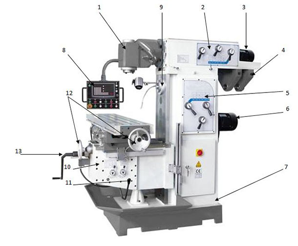 Корпусные детали станка, стол и основание изготовлены из чугуна, что придаёт станку жёсткость и устойчивость к вибрациям. Оба привода фрезерного станка обеспечиваются асинхронными двигателями, которые соединёны с коробкой передач. Фрезерная головка сконструирована так, что может наклоняться вправо и влево для работы шпинделя под углом. Консоль фрезерного станка, составной частью которой является крестообразный подвижный стол, установлена на основании. Продольная и поперечная подача стола осуществляется как вручную, с помощью штурвалов, так и механически. То же самое можно сказать и о вертикальной подаче консоли.