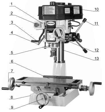 - Рукоятка вертикального перемещения фрезерной головки.