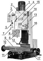 Корпусные детали станка FP – 48 SPN, стол 9 и основание 17 изготовлены из чугуна, что придаёт станку жёсткость и устойчивость к вибрациям. Главный привод фрезерного станка обеспечивается асинхронным двигателем 1, который соединён с коробкой передач. Фрезерная головка 2 с коробкой передач сконструирована так, что может наклоняться вправо и влево, на стойке фрезерного станка, для работы шпинделя под углом. Стойка фрезерного станка установлена на основании 17, составной частью которого является крестообразный подвижный стол. Продольная подача стола производится вручную с помощью моховика 11. Поперечная подача стола производится вручную с помощью маховика 10