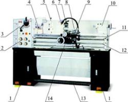 На левом конце станины крепится шпиндельная бабка 3 и коробка подач 2. В шпиндельной бабке находится коробка скоростей станка, основной частью которой является шпиндель. На шпинделе установлен зажимной патрон 4. Коробка подач 2 служит для передачи движения от коробки скоростей на ходовой вал 12 или ходовой винт 11. В корпусе шпиндельной установлен электрический блок управления.
