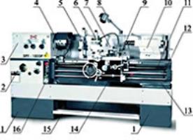 На левом конце станины крепится шпиндельная бабка 3 и коробка подач 2. В шпиндельной бабке находится коробка скоростей станка, основной частью которой является шпиндель. На шпинделе установлен зажимной патрон 4. Коробка подач 2 служит для передачи движения от коробки скоростей на ходовой вал или ходовой винт. На корпусе коробки подач установлен электрический блок управления 16.