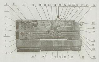 | 1 | Рукоятка перемены скорости главного шпинделя | 20 | Винты крепления суппорта |