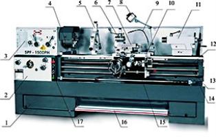 На левом конце станины крепится шпиндельная бабка 3 и коробка подач 2. В шпиндельной бабке находится коробка скоростей станка, основной частью которой является шпиндель. На шпинделе установлен зажимной патрон 4. Коробка подач 2 служит для передачи движения от коробки скоростей на ходовой вал или ходовой винт. На корпусе коробки подач установлен электрический блок управления 17.